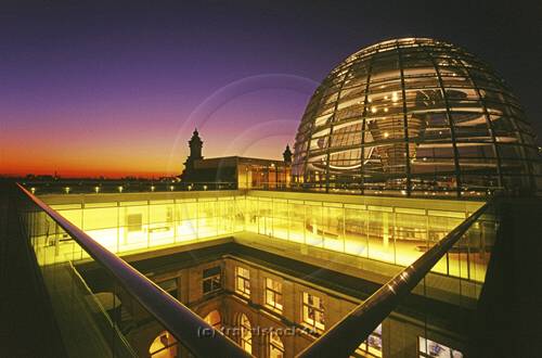 Berlin, Reichstag, roof terasse, dome by Norman Forster, twilight |