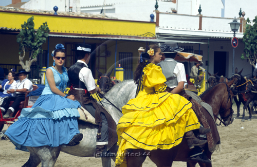 Spain, Andalucia, El Rocio, horse riders in flamenco style at Romeria . El Rocio is located in the